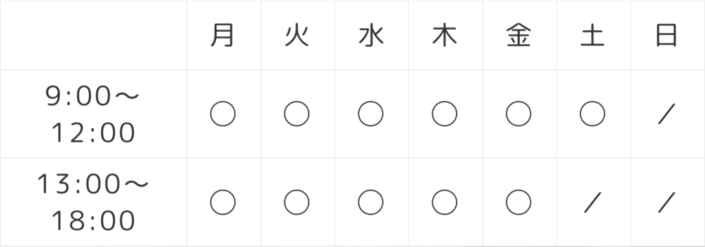 | 9:00〜12:00 | ◯ | ◯ | ◯ | ◯ | ◯ | ◯ | / |